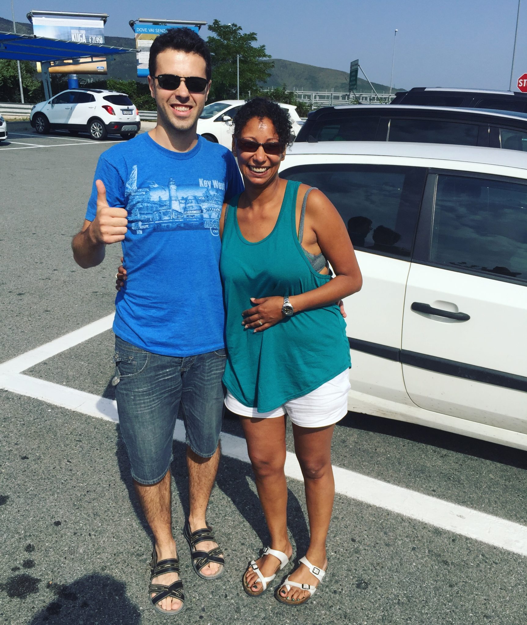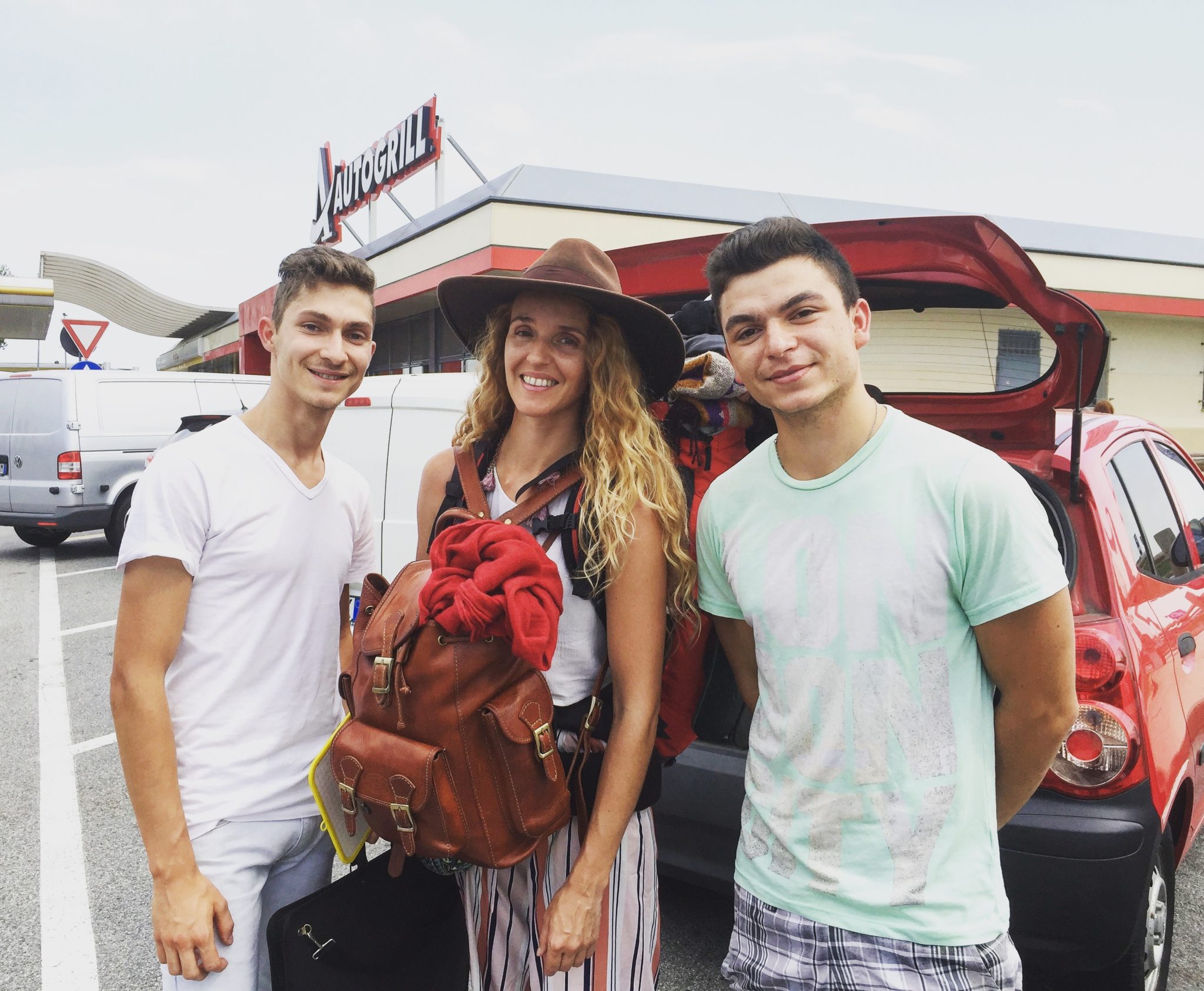 J’attends en totalité, cet épisode inclus, plus d’1h15 sous un cagnard digne d’une journée dans le désert, il fait plus de 40 degrés au soleil, avant que deux jeunes absolument adorables, l’un est d’origine Serbe et l’autre est Roumain, Bogdan et Nicolae, tous deux extrêmement serviables, me déposent à une station essence Autogrill sur l’autoroute alors que ce n’est absolument pas leur destination. Ils m’offrent généreusement un petit café d’adieu, encore une fois la gentillesse d’inconnus envers moi est extraordinaire, cela compense plus que largement avec le petit incident préalable. Sur le parking, au moment de se quitter nous demandons à un couple d’immortaliser le moment. Puis, de manière spontanée Bogdan leur demande où ils vont. J’embarque avec eux direction Gènes, l’attente fut très brève cette fois-ci! Le couple, Estelle et Emmanuel, vont prendre le bateau dans le port de Gènes, où la promesse de vacances en Sardaigne les enthousiaste. De cet endroit au beau milieu de l’autoroute les voitures vont soit en direction de la France, soit de Florence, ce n’est pas l’endroit le plus stratégique mais au moins j’ai avancé de 150km, c’est mieux que rien. Un inconnu vient vers moi pour m’offrir un bouteille d’eau. Merci la vie.